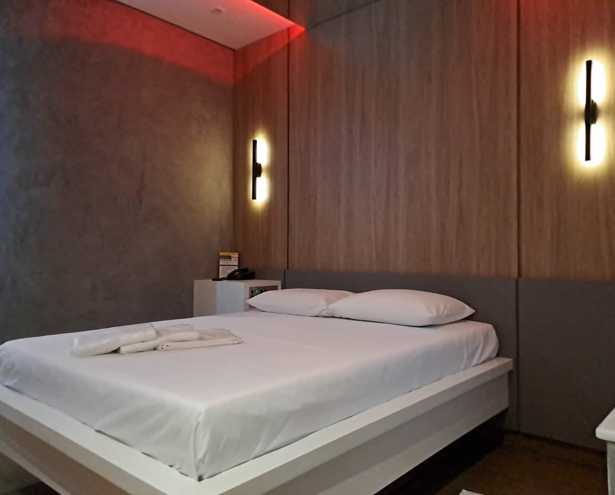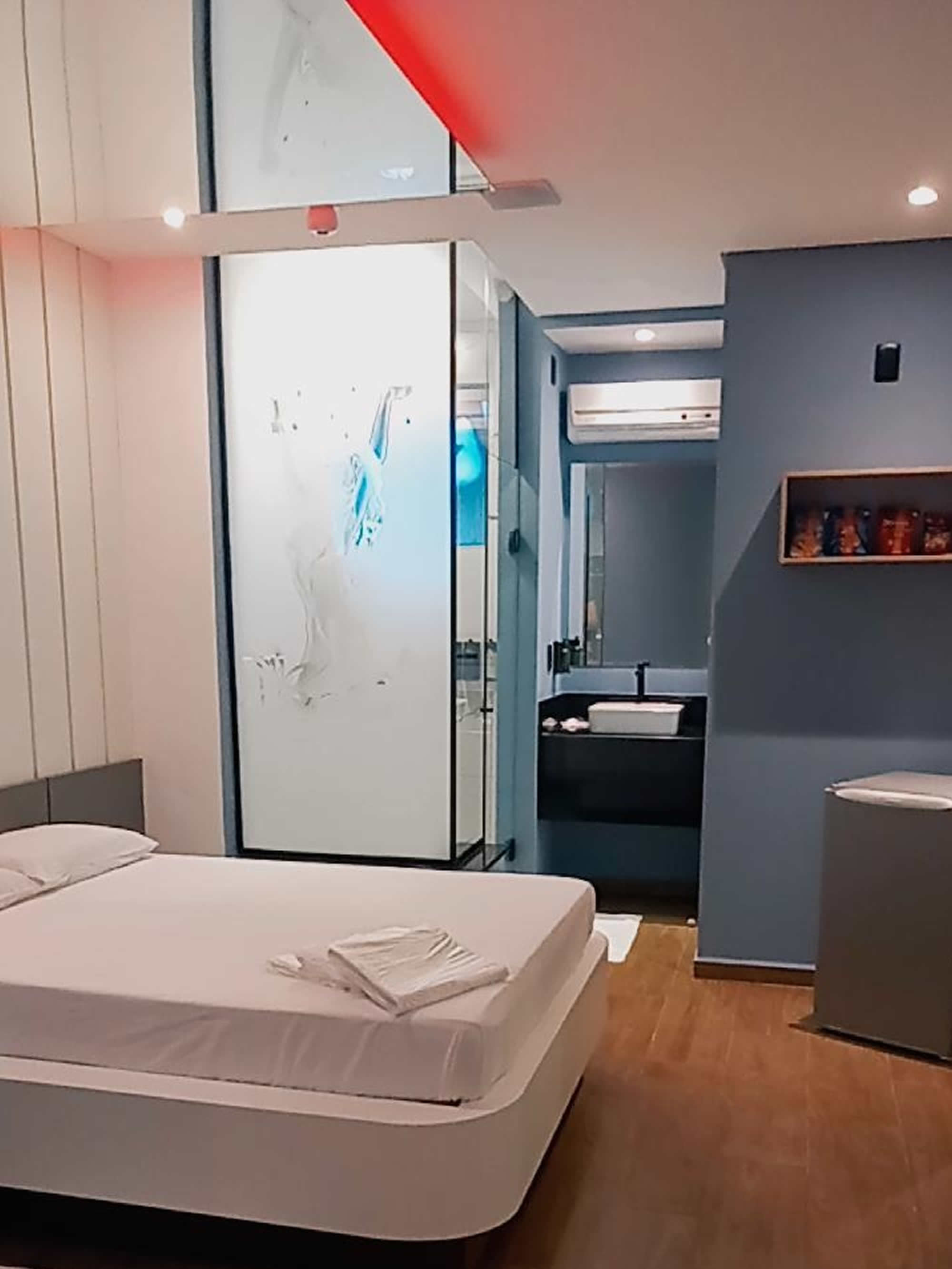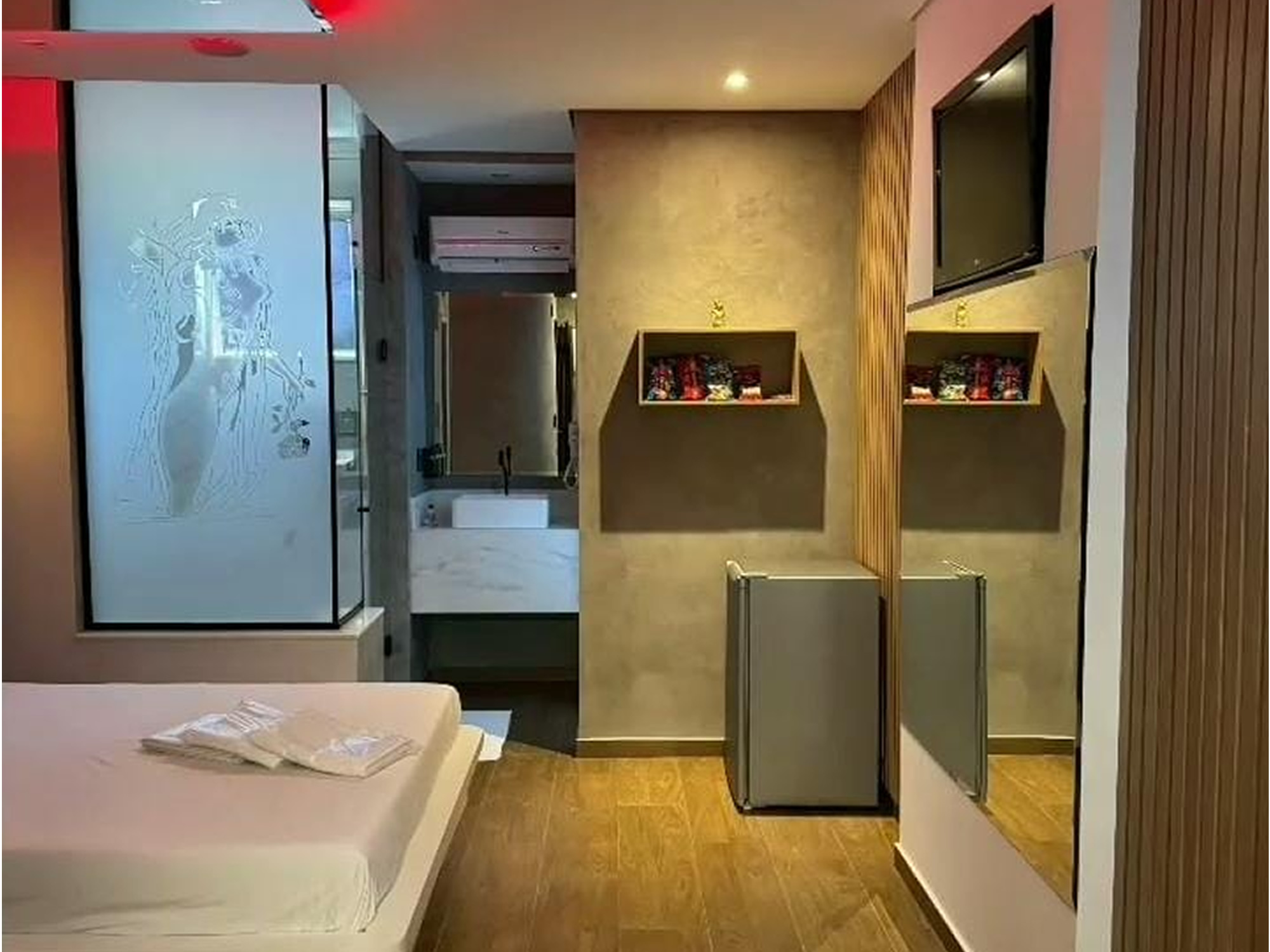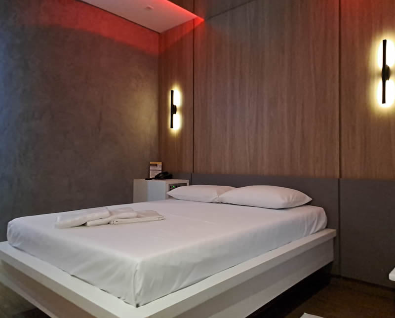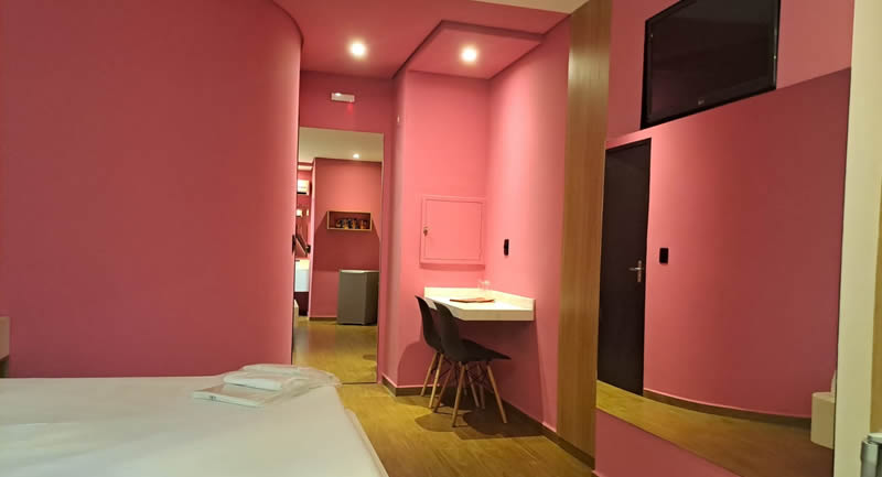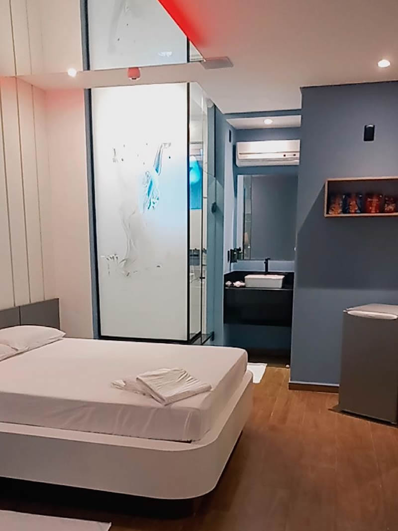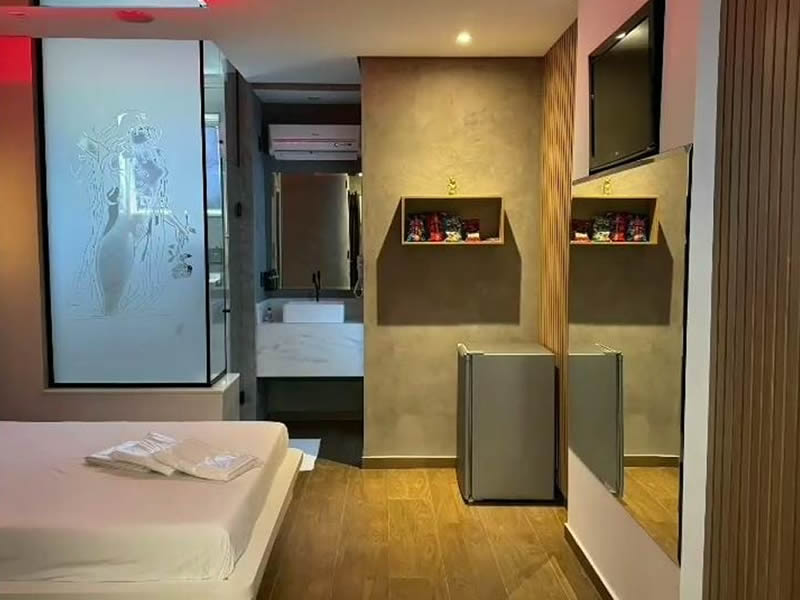 Essa suíte conta com TV 32", espelho no teto, frigobar, ar condicionado quente e frio, duchas individuais, decoração clássica e secador de cabelos.